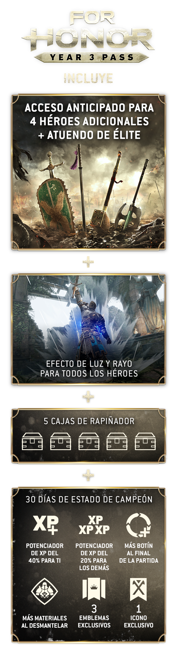 ¡El año del Heraldo está casi encima! Mejora tu experiencia de For Honor con el pase del año 3. Consigue acceso VIP anticipado a los 4 nuevos héroes y contenido adicional exclusivo.